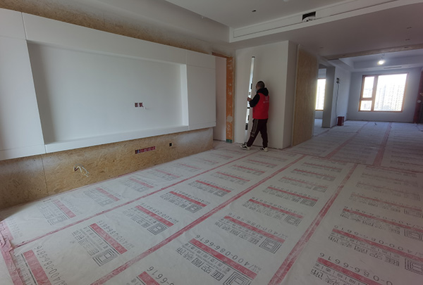第二、燈光打磨:工人在做乳膠漆、墻紙、硅藻泥等基層的時候,全部帶燈光進行打磨,保證墻面,頂面基層的平整度和飽滿度。