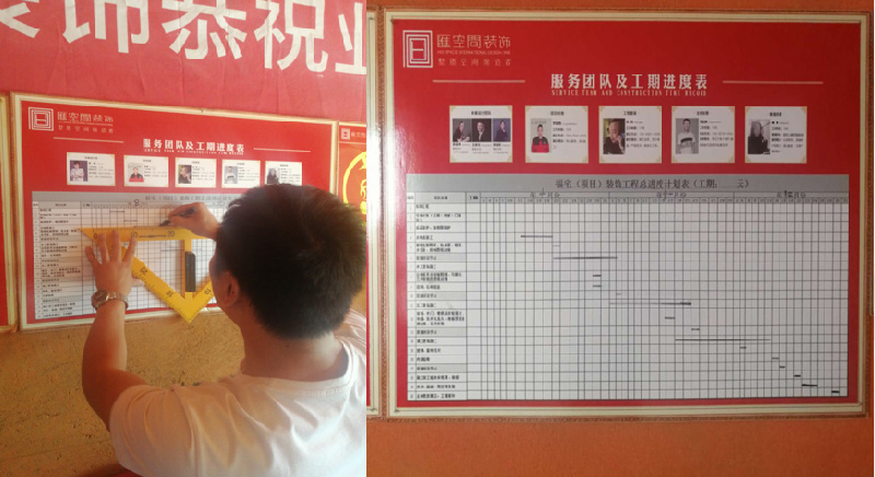 進場交底后填寫全案整裝施工進度計劃,發客戶心連心群里,計劃表要水性筆認真、準確填寫,施工工序進度嚴格按照進度表施工。